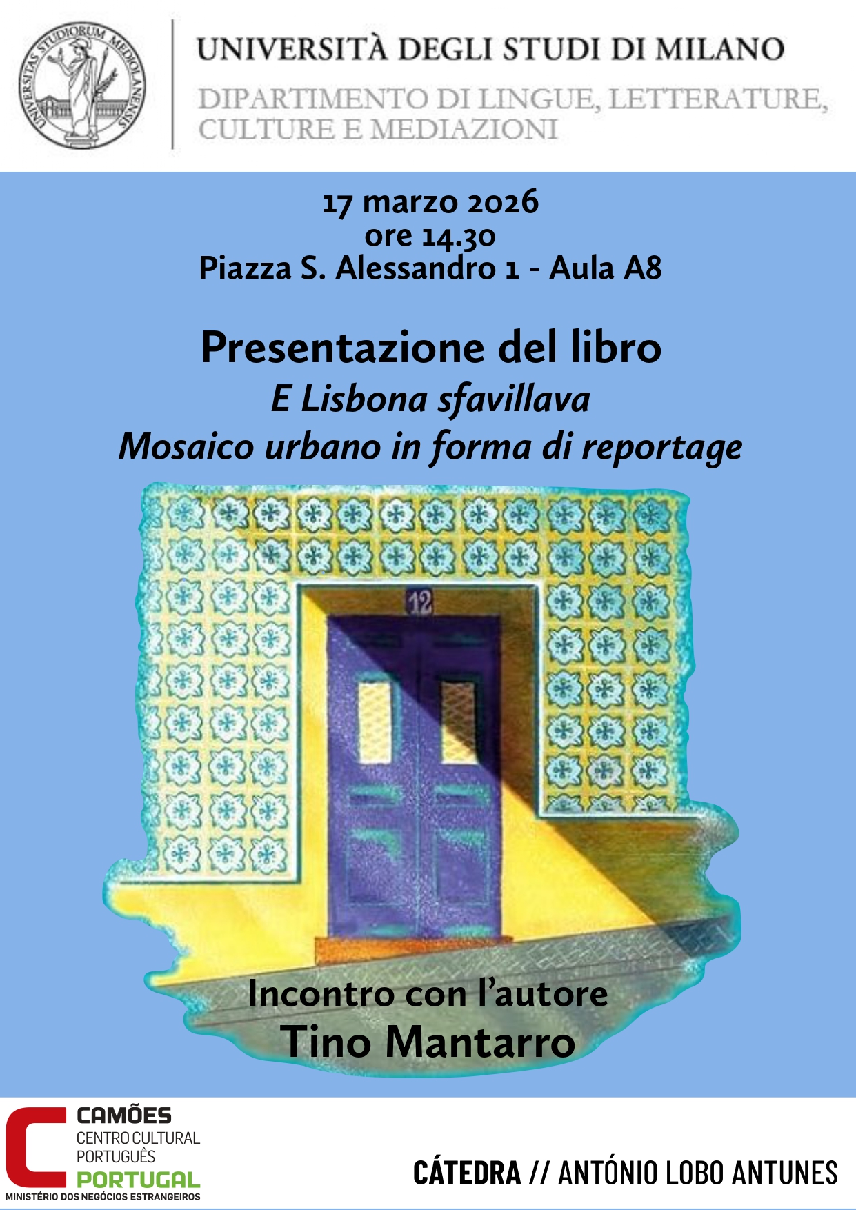 Presentazione del libro E Lisbona sfavillava Mosaico urbano in forma di reportage 17 marzo 2026 ore 14.30 Piazza S. Alessandro 1 – Aula A8 CÁTEDRA ANTÓNIO LOBO ANTUNESLisbonatino mantarroUniMi